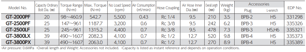 GT-2000PF Air Impact Wrench Lightweight F-Hammer | GT-2500PF Air Impact Wrench Lightweight F-Hammer | GT-2500LF Air Impact Wrench Lightweight F-Hammer |